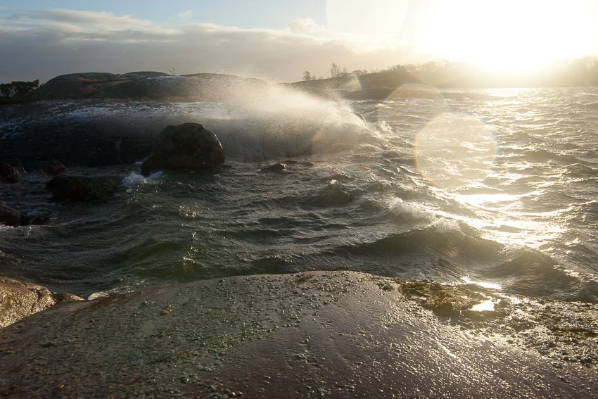 Heräsimme hämärään aamuun, aurinko nousi hiljalleen kummallisesta suunnasta, eteläkaakosta. Aloitimme savusaunan lämmittämisen heti aamiaisen jälkeen, jotta saisimme saunan riittävän kuumaksi ja makoisat löylyt. Aamupäivän aikana tuuli yltyi, puhaltaen keskipäivän aikaan 16 metriä sekunnissa. Kävelimme kaakon suuntaan kurkottavan kapean Italian muotoisen niemen kärkeen. Niemi on suojaisessa lahdessa, mutta siitä huolimatta tuuli sai aallot löymään roiskeita n. 3 metriä korkean ja 20 metriä leveän niemen yli. Komeaa katseltavaa, onneksi tuulen suunta oli sataman suhteen suosiollinen ja vene lepäsi rauhallisesti laiturissa.