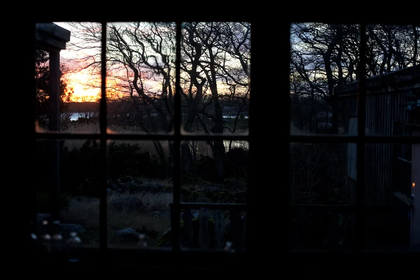 Merivesi oli korkealla, laituri oli juuri ja juuri merenpinnan yläpuolella. Lehdetön rantalepikko näytti karulta ja riisutulta, rannan heinikot kylpivät keltaisena auringossa. Aurinko oli lämmittänyt mökin sisätilan +10 asteeseen, laitoimme tulet hellaan ja takkaan. Kevyen lounaan jälkeen teimme kierroksen saaren ympäri. Paljaat puut ja matalalta paistava aurinko saivat tutun maiseman näyttämään täysin erilaiselta. Luonto oli alaston, puhdas ja valoisa. Aurinko laski outoon ilmansuuntaan, länsilounaaseen klo 15 aikaan.